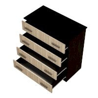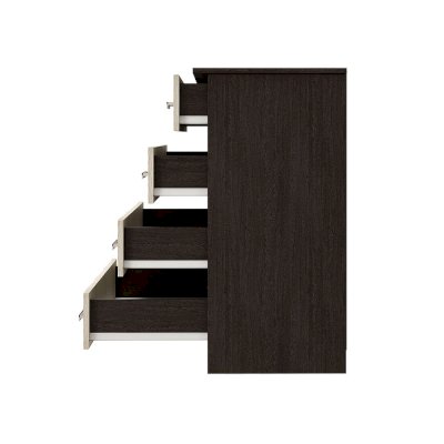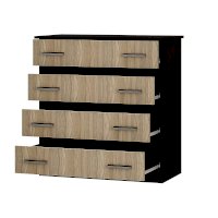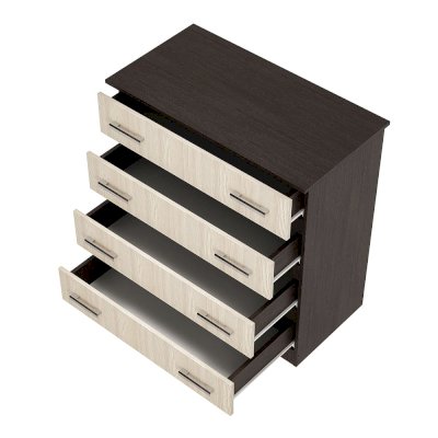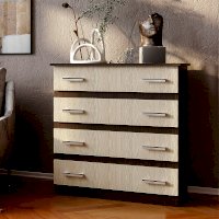 Классическая модель комода Стандарт №6 выполнена из ЛДСП высокого качества. В корпусе используется цвет венге, а фасады выполнены в цвете лоредо. Комод состоит из четырех выдвижных ящиков, на каждом из которых расположены две ручки. Модель Стандарт №6 выделяется увеличенной столешницей, выходящей за границы корпуса.