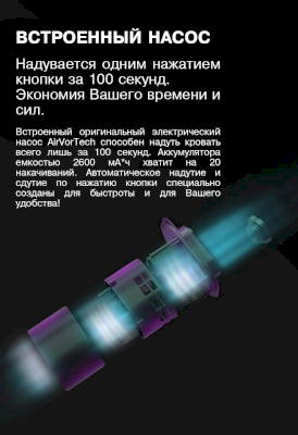 Встроенный оригинальный электрический насос AirVorTech способен надуть кровать всего лишь за 100 секунд. Аккумулятора емкостью 2600 мА*ч хватит на 20 накачиваний. Автоматическое надутие и сдутие по нажатию кнопки специально созданы для быстроты и для Вашего удобства!