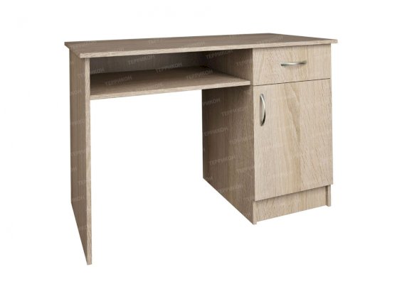 Стол письменный №2 идеально подходит для школьников, студентов, офисных служащих и работников умственного труда. Помимо рабочей поверхности модель оборудована вместительной тумбой, в которую входят скрытое за распашной дверцей отделение и один выдвижной ящик. Мебель надежна и долговечна. Она изготовлена из ламинированной ДСП, имитирующей оттенок и текстуру ясеня шимо светлого.
