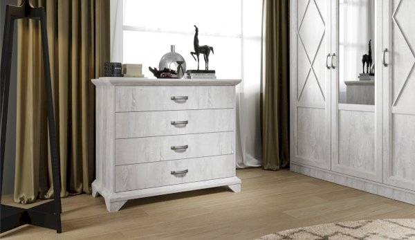 Вместительный комод Лорена в стиле неоклассика создает уютную атмосферу в интерьере гостиной или спальни. Белые фасады с фактурой и рисунком натурального дерева наполняют комнату светом, делают ее просторнее. Металлические ручки цвета состаренного серебра придают изысканность, а фигурные ножки и декоративный профиль крышки подчеркивают стилистику коллекции. В выдвижных ящиках на телескопических направляющих удобно хранить любые предметы одежды и личные вещи. Выполнен из экологичных материалов.
