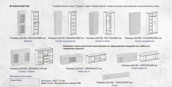 Модульная гостиная Элана Бодега белая (МБГ) - за 27 139 руб. в Вологде. Купите на сайте vologda.onlinemarketmebeli.ru или по телефону 8(800)505-30-63 уже сегодня! Уточнить наличие, комплектацию, актуальную цену можно бесплатно у менеджера ежедневно. Закажите Модульная гостиная Элана Бодега белая (МБГ) до конца акции! Доступна покупка в кредит, рассрочку. Доставим со склада или на заказ.