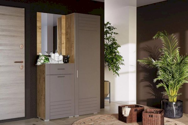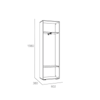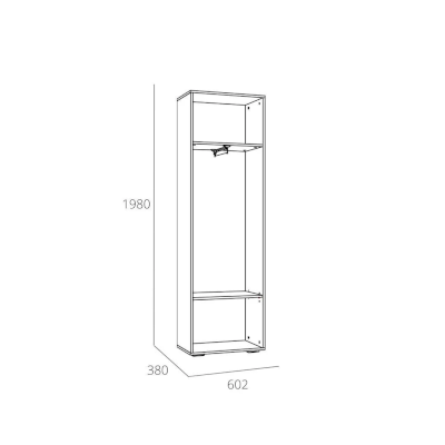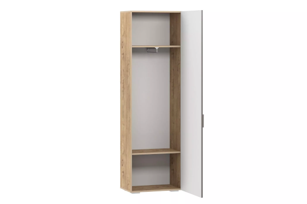 Выдвижная штанга предназначена для размещения одежды на вешалках-плечиках и помогает быстро найти нужную вещь. В шкафу также находятся и две широкие полки. Антресольная полка лучше всего подходит для хранения сезонной одежды, а нижняя – для размещения коробок с обувью.