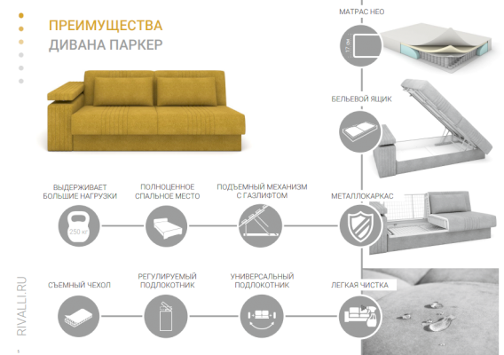 Диван Паркер с одним универсальным подлокотником, который можно фиксировать в 7 разных положениях, отличная альтернатива кровати. В основе дивана – высокий матрас с анатомическим эффектом на основе мультизонального блока независимых пружин и слоя инновационного нетканого материала Skyfiber повышенной комфортности. Механизм трансформации матрикс, позволяет раскладывать диван одной рукой.
