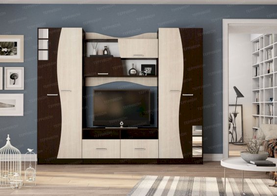 внутреннее наполнение венге/молочный дуб Гостиная «Рио» делает обстановку менее традиционной и более раскованной. Уникальный дизайн удивляет и завораживает! Оригинальное цветовое решение, несколько плавных линий и небольшие зеркальные вставки превращают самую обычную модель в центральный элемент интерьера. Безупречный внешний вид гарнитура обеспечивает ламинированное покрытие естественных оттенков с хорошо различимой текстурой натурального дерева.