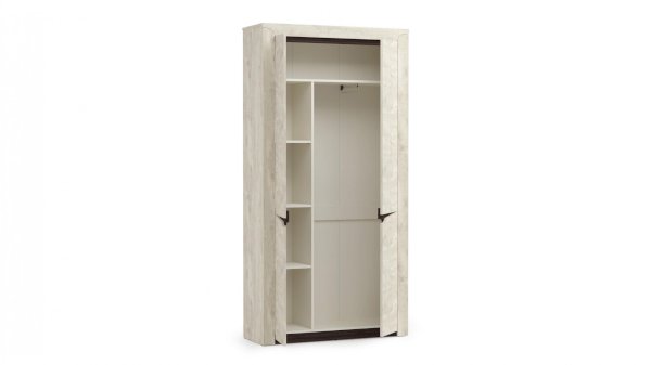 Двухстворчатый шкаф, в котором есть все необходимое, но нет ничего лишнего. Слева полки, справа место для одежды на вешалках. Сверху -  горизонтальная полка-антресоль, которая выдерживает вес до 5 кг.